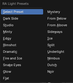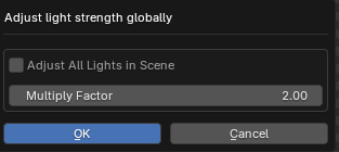 All Render Arena lights will be adjusted – or if you are aware of which preset you want to add, you can select it from the drop-down menu is toggled, all lights will be adjusted. Their strength will be multiplied by the Multiply Factor. Use decimals to divide: 0.5 to half the strength.