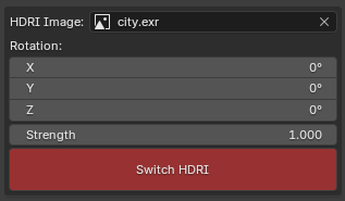 Once added, you can adjust the world rotation and strength. If you want to switch to a different HDRI, you can do that with Switch HDRI