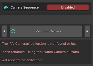 If there is no Active Camera in the scene, and the RA_Cameras collection has not yet been imported – this menu will be very limited and show a warning. We will talk about adding the collection later.