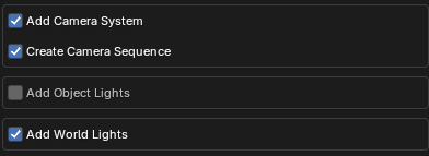 If you select Create Camera Sequence or Add World Lights, further pop-up option for these features will appear after pressing OK.