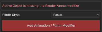 If the Render_Arena_Main_Object modifier hasn't been added to the Active Object yet, a warning will show, and the button Add Animation / Plinth Modifier as well as a Plinth preset style will be shown.